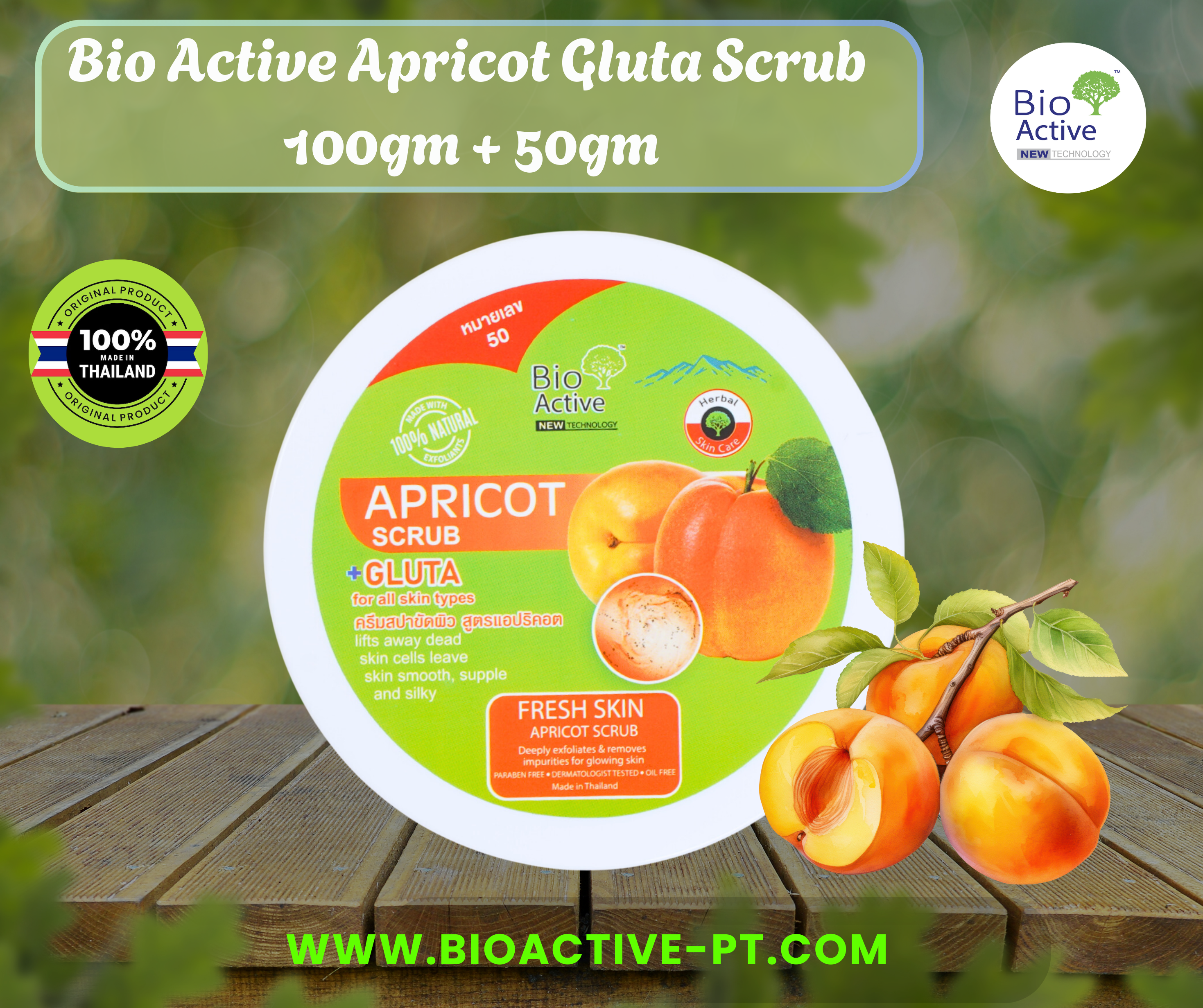 Bio Active Apricot Gluta Scrub Enriched with apricot extracts and glutathione, this exfoliating scrub gently removes dead skin cells, unclogs pores, and brightens your complexion. Perfect for smooth, soft, and refreshed skin. Suitable for all skin types. Shop now!