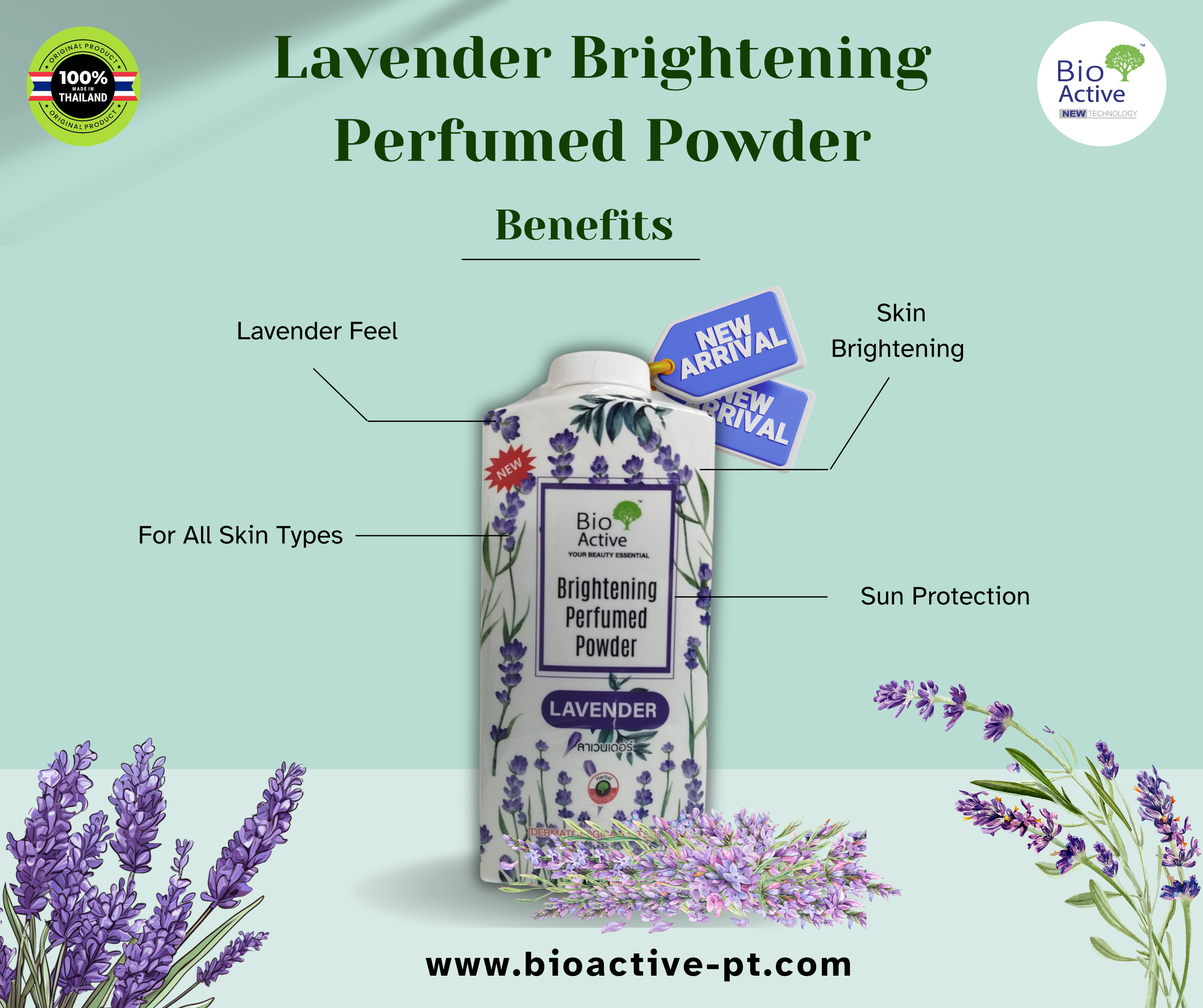 Bio Active Lavender Brightening Perfumed Powder. Infused with natural lavender extracts, this lightweight formula brightens your skin while keeping it fresh and fragrant all day. Perfect for a smooth, radiant look with a soothing lavender scent.