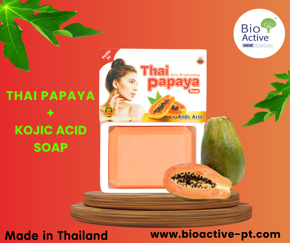 Bio Active Thai Papaya Soap + Kojic Acid is a powerful skin brightening formula enriched with papaya extract and kojic acid to help fade dark spots, hyperpigmentation, and uneven skin tone. This gentle exfoliating soap deeply cleanses, removes dead skin cells, and promotes a radiant, youthful glow while keeping your skin hydrated and refreshed. Suitable for all skin types.